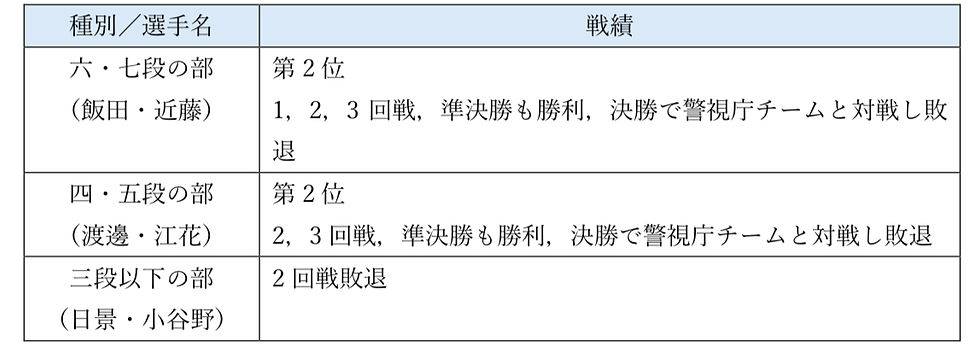 どちらに旗が上がってもおかしくない、警視庁チームと互角以上の重厚な演武でしたが、結果は 0-3。敗れはしたものの、その演武の質は優勝チームと遜色なく、見る者を魅了する素晴らしい内容であったことを特記いたします。